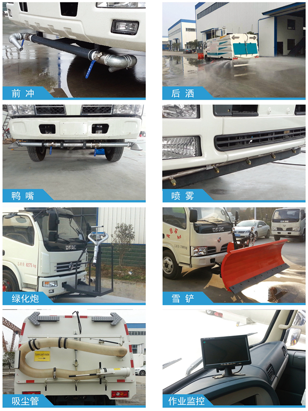 | 選裝配置: | 用戶可根據個人需求選擇加裝前沖、后灑、噴霧、自潔卷盤、作業監控系統、**吸管裝置等配置。 |